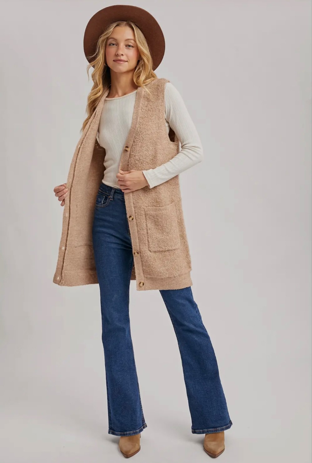 Perfect for layering over your favorite tops and sweaters, this vest combines style and functionality for a chic and cozy ensemble.