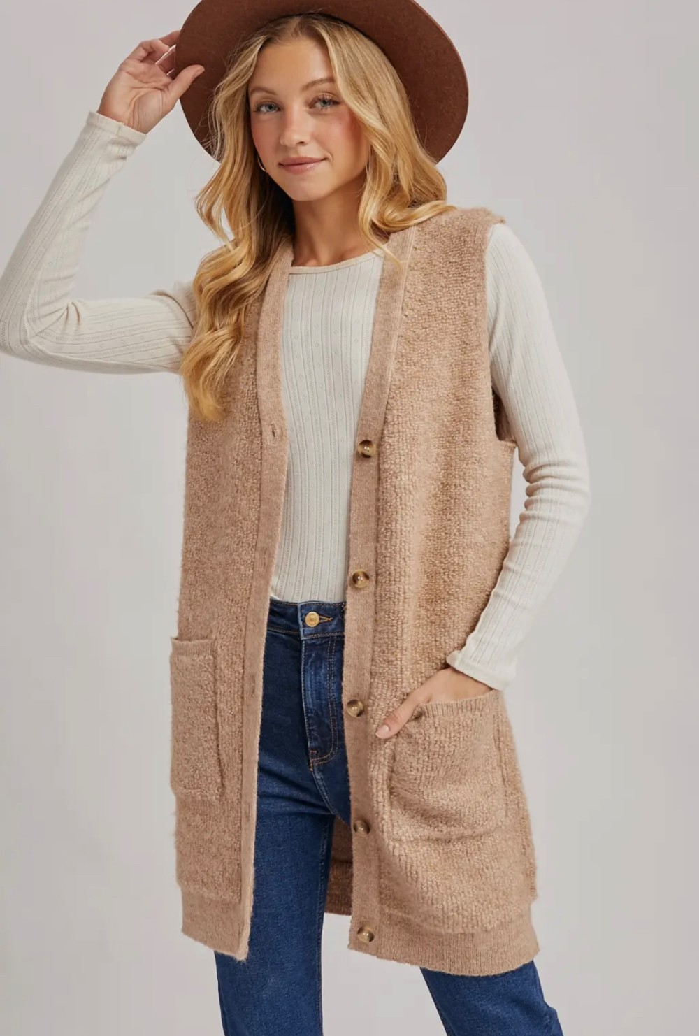 Button down V-neck teddy knit long lined vest. This cozy vest features a plush teddy knit fabric that adds a touch of warmth and texture to your outfit. The button-down front and V-neckline create a classic and versatile look, while the longline silhouette ensures extra coverage and comfort.