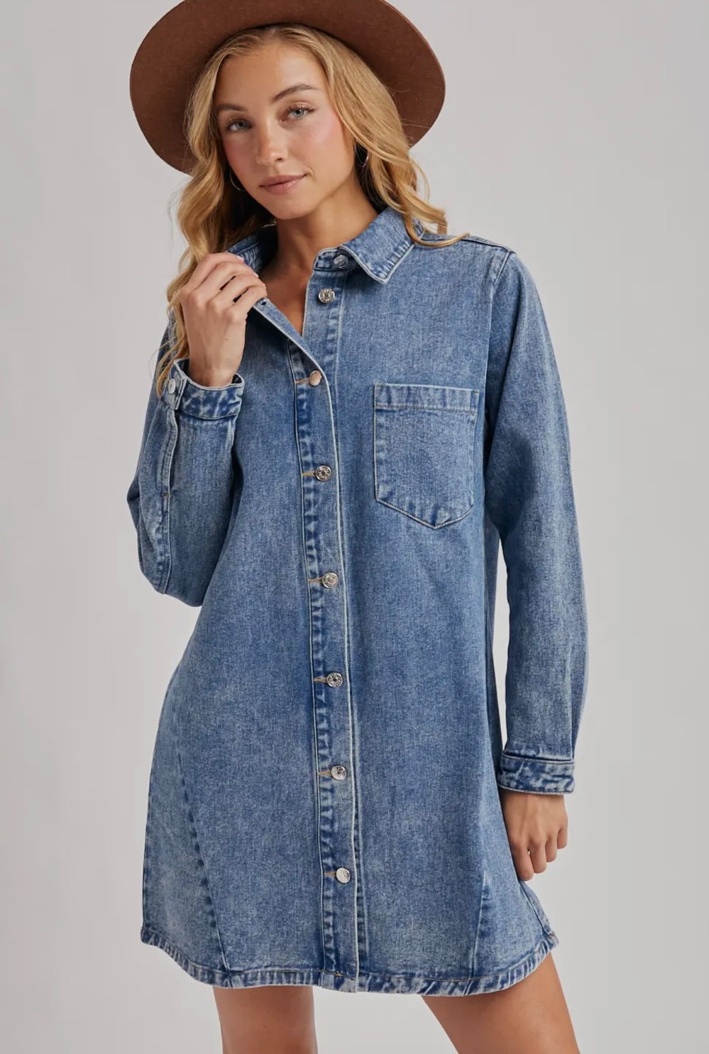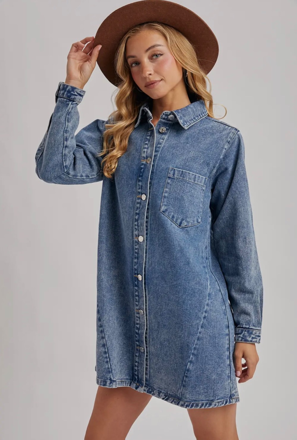 Denim button down shirt dress. This versatile dress features a classic button-down front, offering both style and functionality. Crafted from durable denim, it's designed to flatter with a relaxed fit and can be worn as a standalone dress or layered over leggings or tights. The shirt dress combines timeless appeal with modern comfort, making it a wardrobe staple for any casual or laid-back look.