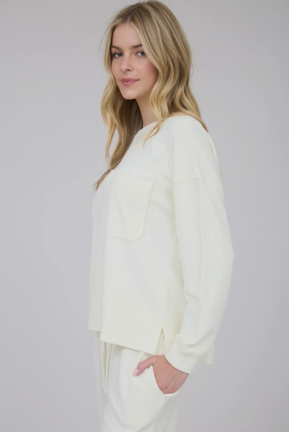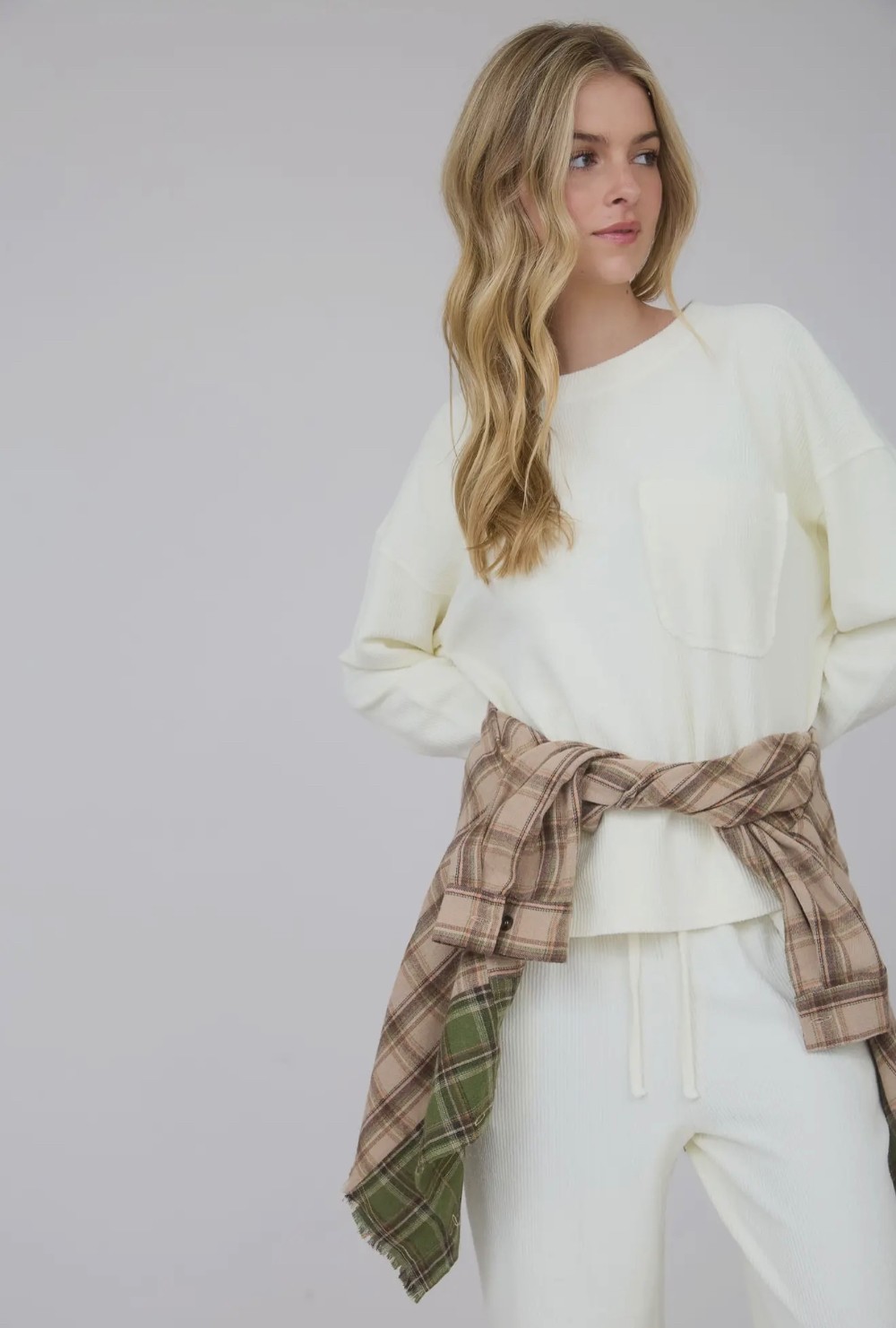 Casual and effortlessly cool, this ribbed long sleeve top is perfect for everyday wear. Designed with a round neckline, drop shoulder, and relaxed fit, it’s finished with a pocket detail for laid-back charm. The ribbed knit texture pairs beautifully with the acid-washed finish, giving each piece a unique look—tones may vary.