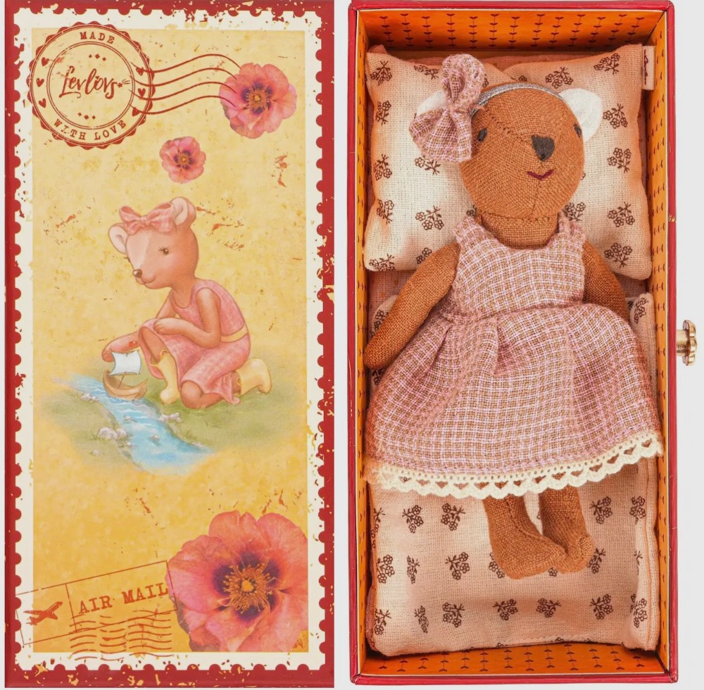 Tucked inside a velvet-soft bed of wildflower pillow and blanket, the Levlovs Bear waits quietly, holding the memory of a tiny paper boat and the gentle babble of a stream. She wears a rose-hued linen dress with vintage lace, a bow atop her ear like a pressed bloom in a diary.